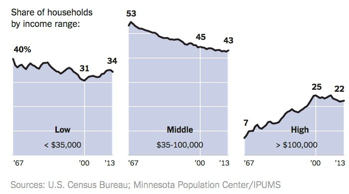 Another problem is that the incomes of middle income households have been stagnant for many years, even well before the Great Recession. For example, in 2013 dollars, the median household income nationally was $56,800 in 2000, $56,436 in 2007 and $51,939 in 2013 (9).