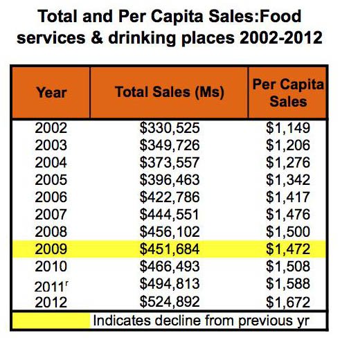 5. Declining Food Away From Home Expenditures, Especially in Middle Income Households. Supply side data from the Census Bureau on the total sales and per capita sales of food services and drinking places between 2002 and 2012, as shown in the table below, appear to indicate that, with the exception of 2009, sales in this industry have had a steady path of growth.