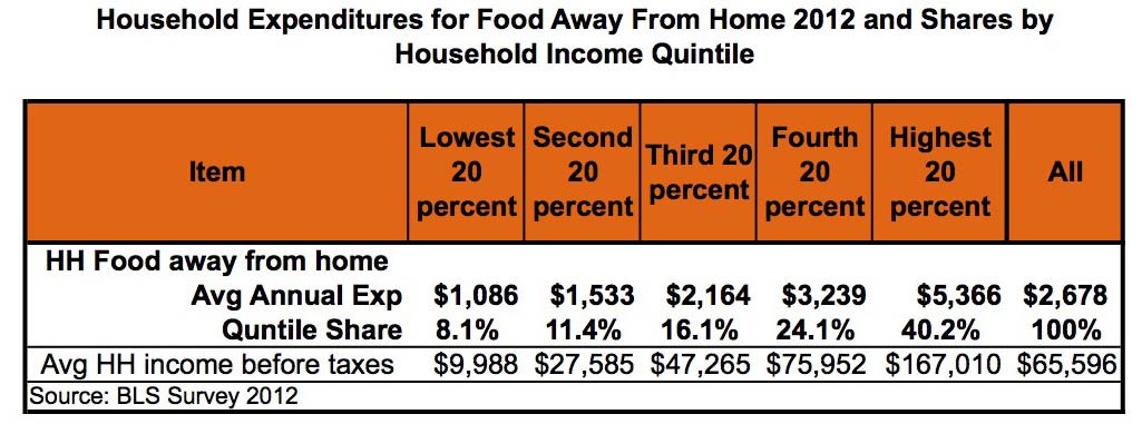 Also, the BLS consistently has found that the households on the highest rungs of the income ladder account for a very disproportionate share of the food away from home expenditures. As can be seen in the table above, the 20% of the households with the highest income in 2012 had an average income of $167,010 and accounted for 40.2% of the nation’s food away from home expenditures. Combined with the next highest income quintile (the fourth 20 percent in the table), they they represent 40% of the households, but close to two-thirds of all food away from home expenditures.