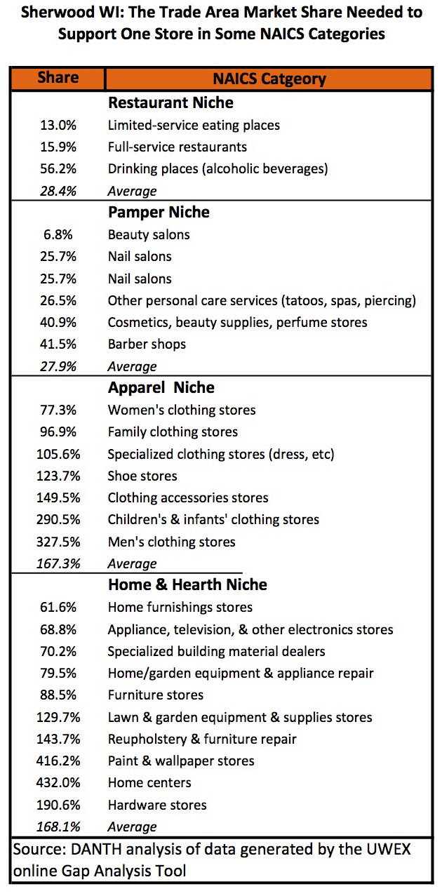 Sherwood demonstrates another pattern, that is rarer, but happens often enough to deserve notice. Sherwood is located on the fringe of the Appleton Metropolitan Area, near a popular state park that sits on Lake Winnebago. Its residents have a median household income of almost $98,000/yr. Its restaurants have total annual sales, about $5.1 million, far above the $2.5 million average for towns in the 2,500 to 5,000 population range found by the Ryan team. DANTH’s research found Sherwood restaurant owners reporting that most of their customers were from other communities, yet there was still sufficient leakage of local residential restaurant expenditures to warrant recruiting some new operators (7). Apparently, the Sherwood restaurants’ concepts were more suited to out-of-towners than local residents, so the residents went elsewhere. This is not an uncommon situation in communities benefiting from a strong tourist trade or that are comparatively affluent and their eating and drinking places attract less affluent diners from nearby communities.