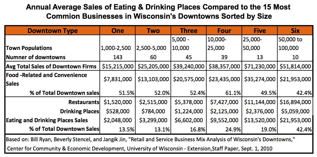 The table above, based on some excellent research by a Bill Ryan led research team, is more reflective of what will be found in most states. It shows some interesting business sales data for downtowns in 303 communities in Wisconsin with populations ranging from 1,000 to 100,000. It presents the average total annual sales of eating and drinking places in these downtowns and enables them to be compared to the total annual sales of the 15 most common types of business found in these downtowns, with the results sorted into six categories according to the towns’ population sizes. Some findings to consider: