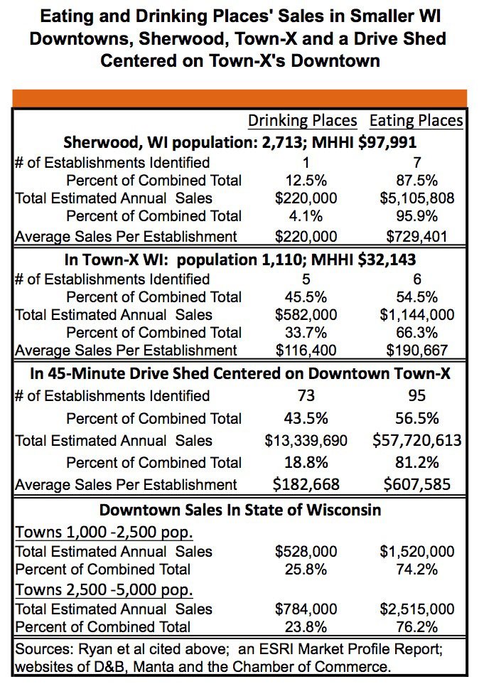 To get some tangible idea of what such sales might mean in smaller communities, let us consider two small communities in WI, Sherwood and Town-X. The table immediately below presents some data on their restaurant scenes.
