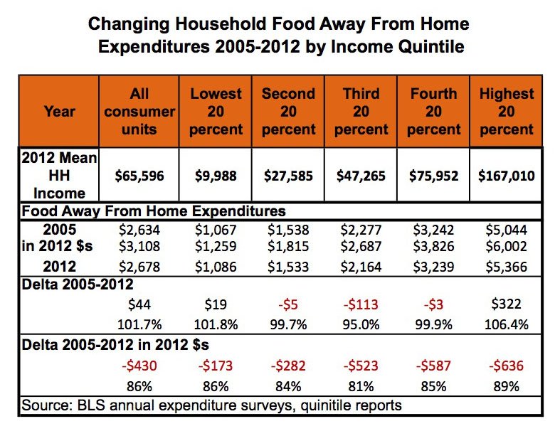 However, demand side data from the BLS, based on large annual, rigorously done surveys, tell quite a different story. The table immediately above shows a comparison of food away from home expenditures for 2005 and 2012 broken down by household income quintiles in two ways, with one converting the 2005 expenditures into 2012 dollars. The analysis using unconverted 2005 dollars shows: